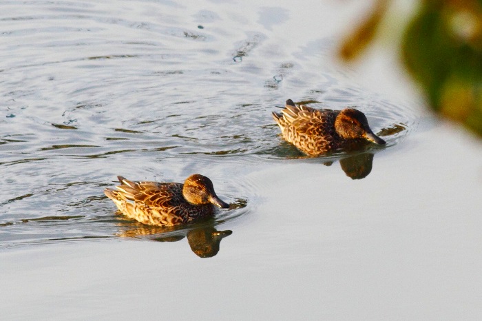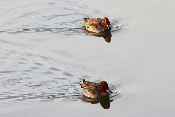 陽光の影響で見にくいですが、小さなカモ類で尾に沿って白線が見られます。