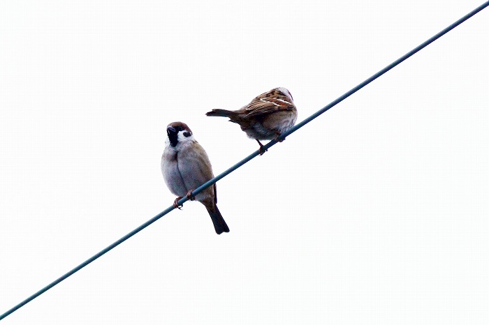 思い切りトリミングした画です。スズメの後頸部は白いのですが、頭の一部も白いスズメ