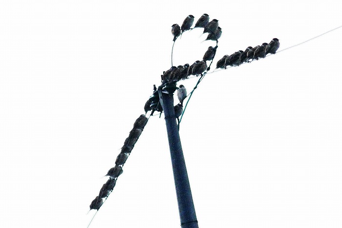 葦原で遊んでいたスズメが一斉に此の電柱の近くにとまり、身を寄せ合ってい