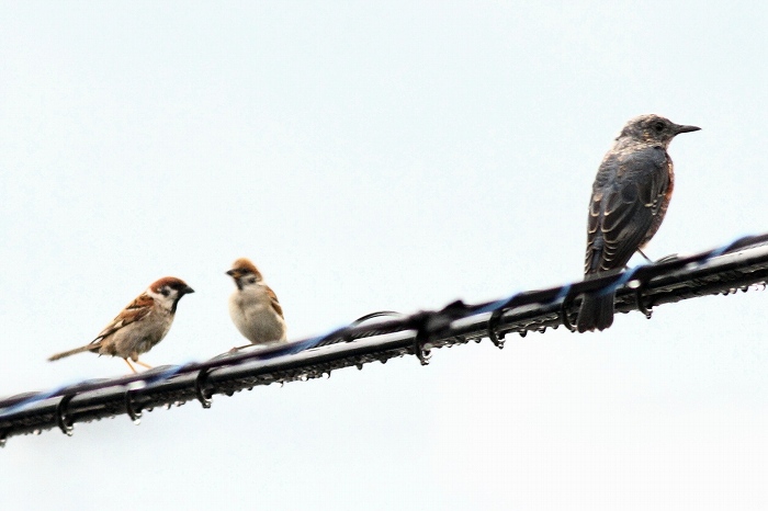 2012年 スズメ 008 戻る 撮影(07/01) スズメよりイソヒヨドリの方にピントが合ってしまっています。スズメの近くに仲良 くイソヒヨドリがとまっています。此のイソヒヨドリは幼鳥♂です。異種の鳥たちと顔 見知り関係になった個体は、過去の経験から、別家イヒヒ女王の後継者としては 有力だと考えています。 (Canon) EOS 7D EF400mm F5.6L USM