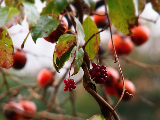 柿の木に巻き付いて新鮮そうな色合いを見せている他の実にピントを合わせ、