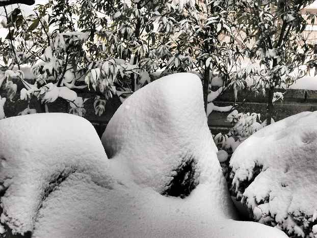 2012年 花や風景や 020 戻る 撮影(02/02) 先ずイソヒヨドリ003をご覧下さい。約24時間後の光景です。イソヒヨドリ♀が 立っていたのは、真ん中の庭石です。現在も吹雪が続いています。 (OLYMPUS)E-PL2 M.ZUIKO DIGITAL ED 12-50mm F3.5-6.3 EZ