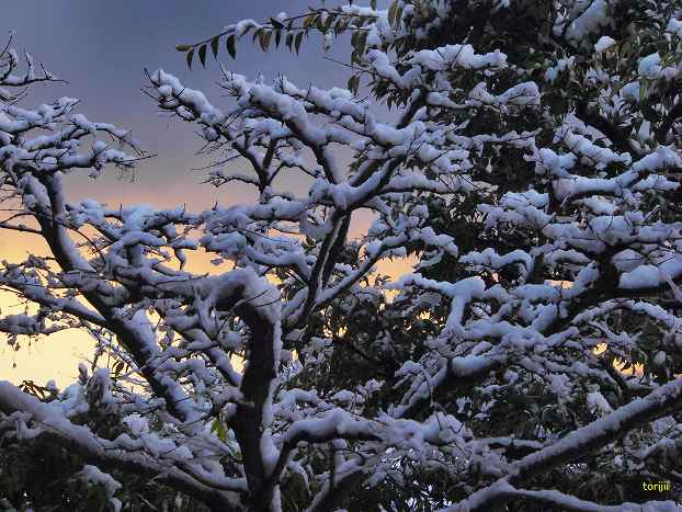 2012年 花や風景や 028 戻る 撮影(02/17) 予報通りに雪が降っています。大雪になるかどうかは、今夜が問題です。一時 的に南の空が明るくなった時に撮りました。我が家の庭です。 (OLYMPUS) E-PL2 M.ZUIKO DIGITAL ED 12-50mm F3.5-6.3 EZ
