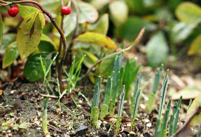 2012年 花や風景や 031 戻る 撮影(02/23) 我が家の庭には未だ雪がありますが、木の近くは土が出て来ました。 そこには春が芽生えていました。スイセン(水仙)だと思います。赤い実は ヤブコウジです。 EOS 5D Mark II EF100mm F2.8L Macro IS USM