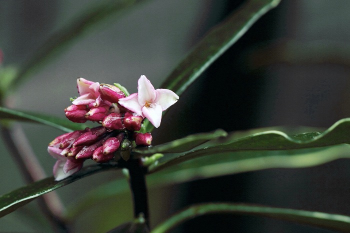 激しい雨風の中にジンチョウゲの花が咲きました。我が家の庭の光景です。