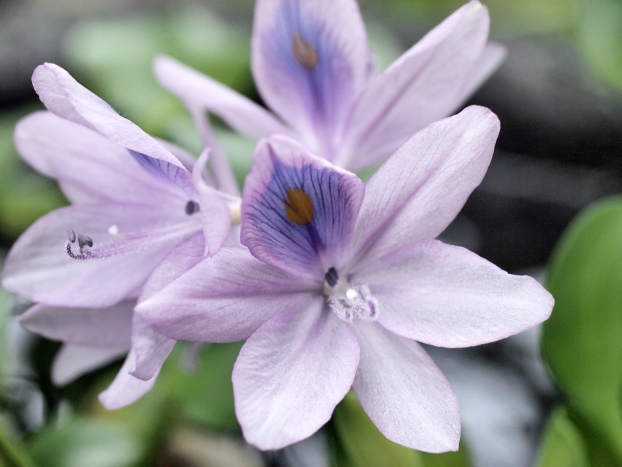 2012年 花や風景や 148 戻る 撮影(07/13) 布袋葵(ほていあおい、Eichhornia crassipes)です。 庭の石臼に溜まった水に開いた花を載せています。 (OLYMPUS) E-PL2 (Panasonic)LEICA MACRO 45mm/F2.8
