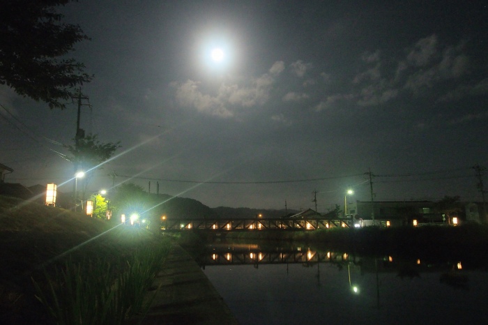 2012年 花や風景や 161 戻る 撮影(08/02) 昨日は月輝面100%でしたので、記念に撮りました。撮影場所は我が家の 前で、川面近まで下りた所です。街灯の灯りが強くて、私の能力ではこの程度 がいっぱいいっぱいです。 (OLYMPUS) OM-D E-M5 M.12-50mm F3.5-6.3