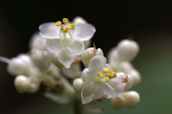 2012年 花や風景や 171 戻る 撮影(08/11) 薮茗荷(やぶみょうが、Pollia japonica)です。かなり近寄って、よくよく 見ないと、花が開いているのやら、開いていないのやら、分かりません が、今が見ごろです。 庭に咲いている花を載せています。 (Canon) EOS 60D EF100mm F2.8L Macro IS USM