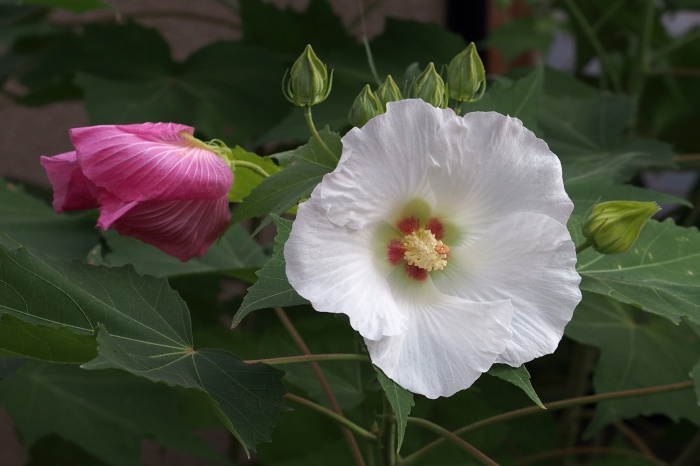 2012年 花や風景や 199 戻る 撮影(09/21) 庭に咲いた酔芙蓉(すいふよう、Hibiscus mutabilis forme versicolar)です。 写真右はいま飲み始めた朝の花で、左は昨日酔いつぶれた花です。 (OLYMPUS) OM-D E-M5 M.ZUIKO DIGITAL 45mm F1.8