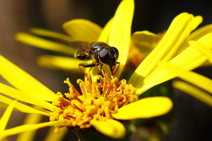 2012年 花や風景や 231 戻る 撮影(10/26) 大小の虫が居ましたので撮りました。手持ちです。 花は石蕗(艶蕗、つわぶき、Farfugium japonicum)です。 撮影地は庭です。 (Canon) EOS 60D EF100mm F2.8L Macro IS USM