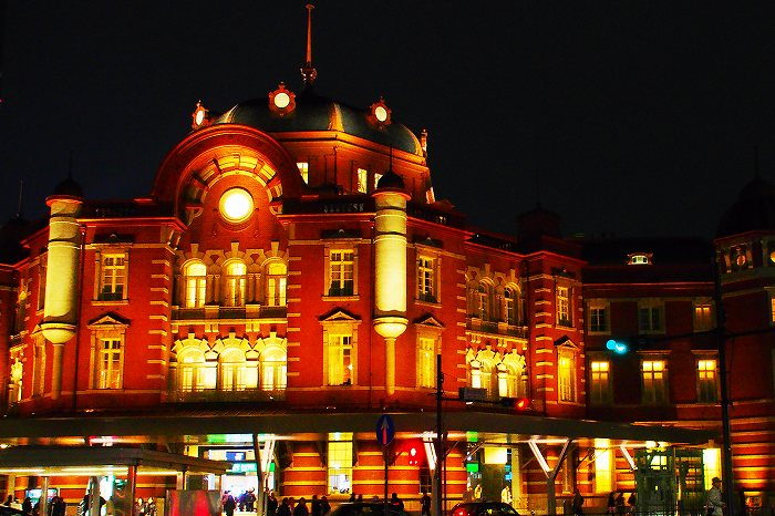 夜の東京駅です。白トビで文字盤や針が消えている円い物は時計です。此処