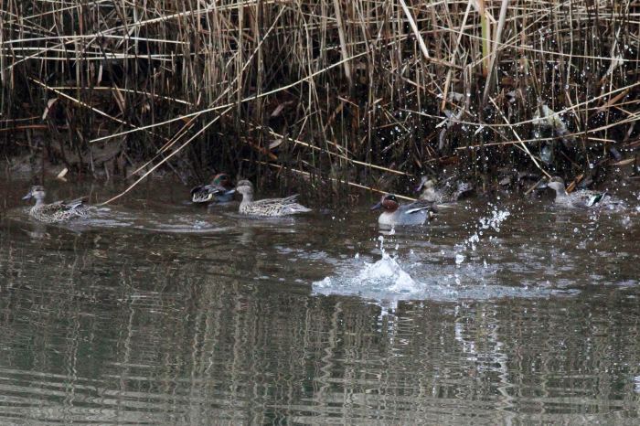 コガモ連が餌を食べています。カイツブリが近寄って行ったのですが、全