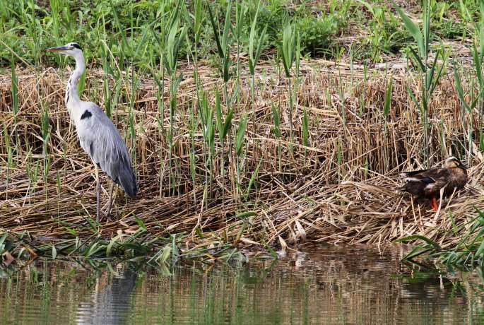 その近くの岸辺にカルガモが上がり、くつろいで羽繕いなどをします。顔見