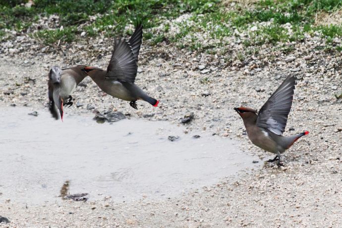 ヒレンジャクは自分より大きい鳥にも怖れることなく、逆に攻撃する構えを見せ