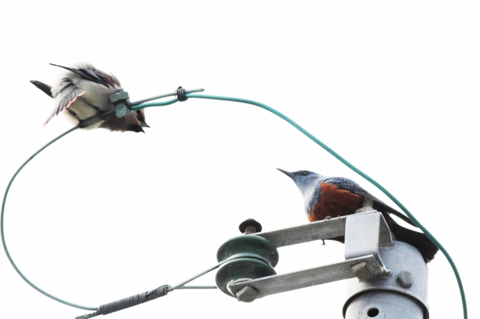 自分のソングポストにとまったので、イソヒヨドリ♂が様子を見に来たのですが、