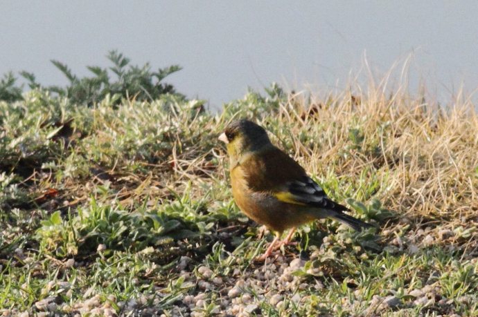 留鳥です。♂です。大きさはスズメより少し小さいと思います。翼の黄色斑が