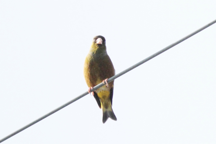 目立ちます。尾にも黄色い部分が見られます。太い嘴で、色は肉色です。