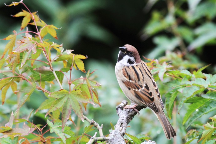 2014年 スズメ 014 戻る 撮影(11/01) 11月二番目の登場です。連日5〜6羽が飛び回っています。 昨日朝、フクロウらしき鳴き声を聞いた時、スズメ達は直ちに電線にとまり、 周囲を見回していました。スズメの動きを見ていると、猛禽類の接近を推測 することが出来る場合があります。 (Canon) EOS 7D EF400mm F5.6L USM