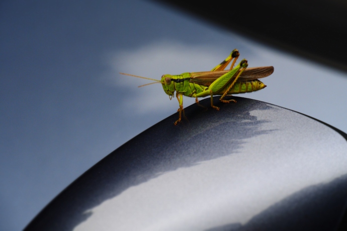 私の車に乗り、長い時間じっとしていて、旅行気分に浸っているバッタです。