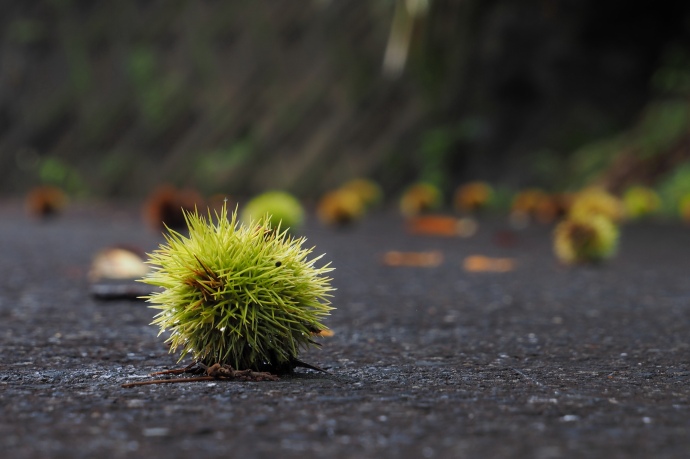 続きが原因でしょうか。沢山の栗の実が路上に落ちて転げていました。