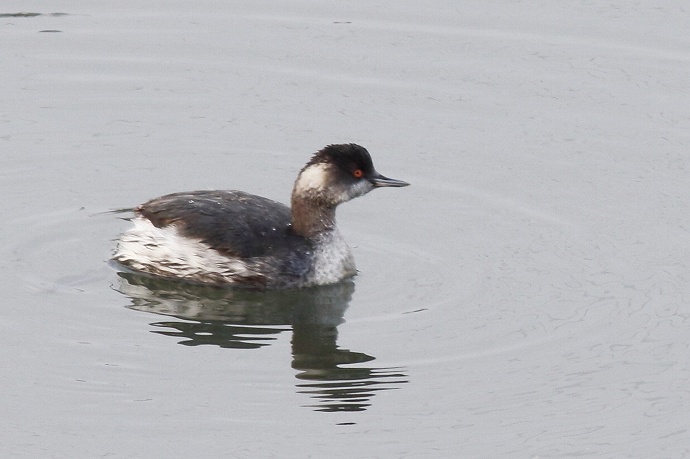 2015年 ハジロカイツブリ 001 戻る 冬鳥です。カイツブリより少し大きく、コガモより少し小さい感じです。 2007年以来、久々の登場です。 冬羽ですから地味な色合いです。赤い虹彩です。カイツブリは黄白色です。背と 翼は黒褐色です。頭から胸も黒色です。 喉は白色です。当然ですが潜水は上手です。(撮影01/25) (Canon) EOS 7D Mark II EF400mm F5.6L USM