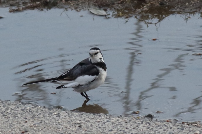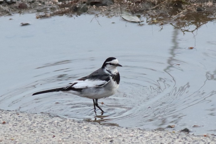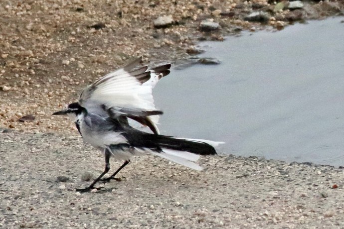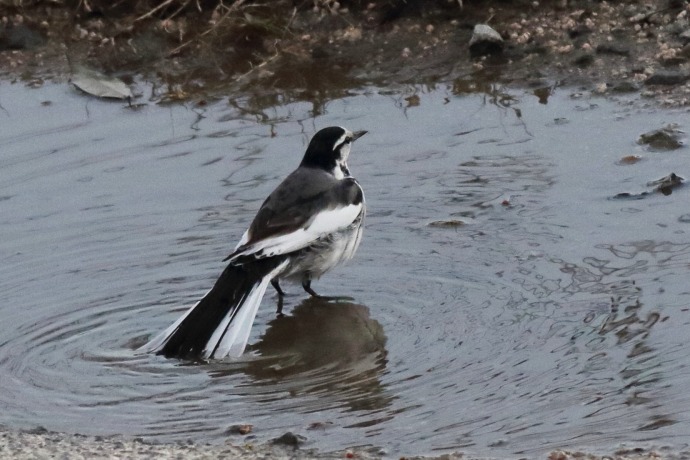 水浴びする直前です。尾っぽは、尾羽の外側に白い羽があります。