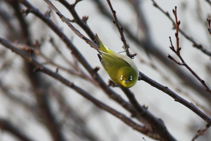 2015年 メジロ 001 戻る スズメより小さい鳥です。留鳥です。白いアイリングが特徴です。 下面は汚白色で、喉から胸は黄色で、脇は紫褐色です。 連日鳴き声は聞きますが、小さな体ですし、いつも動き回っていますので、うま く撮れません。(撮影01/11) (Canon)EOS 5D Mark II EF400mm F5.6L USM + EXTENDER EF 1.4x II