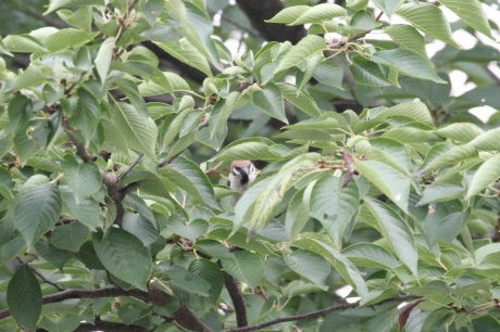 ソメイヨシノの葉っぱの中にスズメが1羽居ます。(撮影07/05)