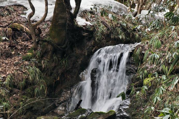 私は近くの小さな滝撮りを楽しみました。斜面の残雪はご覧の通りで、雪が溜