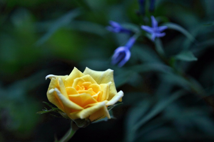 2015年 花や風景や 069 戻る 撮影(05/07) 庭に咲いているミニチュア ローズ(Miniature rose)です。右上の方にぼやーっ と見えている青っぽい花はチョウジソウ(丁字草、Amsonia elliptica)です。 (Canon) EOS 5D Mark II (TAMRON) SP AF 180mm F/3.5 MACRO