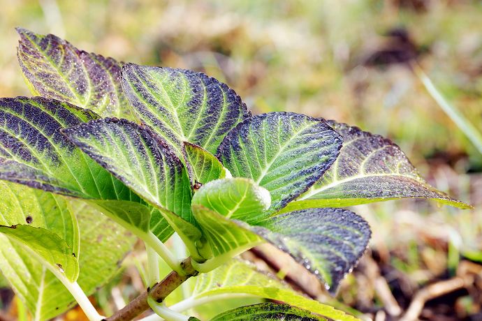 アジサイ(紫陽花、Hydrangea macrophylla)の葉っぱの姿です。花より葉の