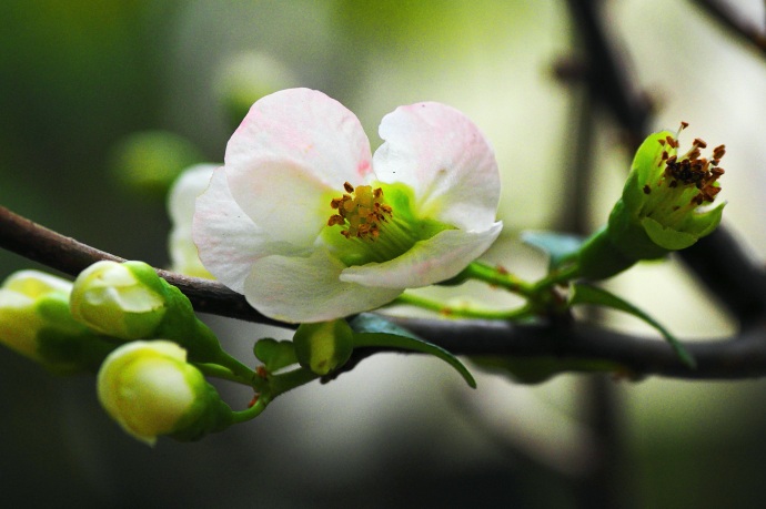 2016年 花や風景や 181 戻る 撮影(11/28) 庭にボケ(木瓜、Chaenomeles speciosa)が咲きました。此のボケは開花した 時は真っ白ですが、少し時間が経つと徐々にピンク色になって来ます。 (OLYMPUS) OM-D E-M1 M.ZUIKO DIGITAL ED 12-100mm F4.0 IS PRO