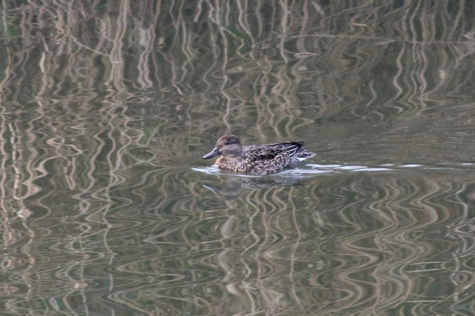 2017年 コガモ 003 戻る 撮影(11/08) 08日昼頃一羽のコガモが着水し、かなりの時間同じ場所を動かずにきょろ きょろと周囲を見回していました。渡って来たばかりの行動だと思いました。 ♀なのかエクリプスなのか正確には分かりませんが、下尾筒あたりの模様を みますと、なんとなく♂の姿を感じさせます。 (Canon) EOS 7D Mark II EF400mm F5.6L USM