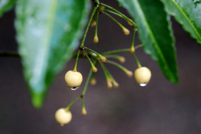 実が赤くならないマンリョウ(万両、Ardisia crenata)です。