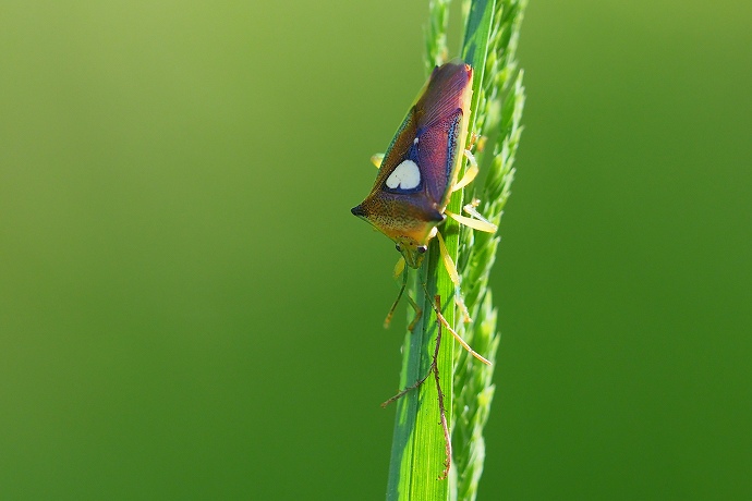 2017年 花や風景や 082 戻る 撮影(05/04) 町内の公園でこんな虫を見つけました。ハート型の模様を背負っていてオシャレ な虫です。特徴がありますのでネットで簡単に種類を知ることが出来ました。 エサキモンキツノカメムシです。 (OLYMPUS)OM-D E-M1 Mark II M.ZUIKO DIGITAL ED 40-150mm F2.8 PRO