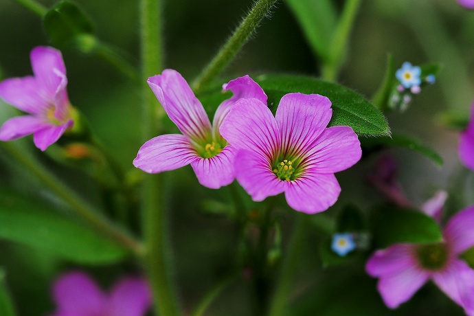 2017年 花や風景や 086 戻る 撮影(05/11) ムラサキカタバミ(紫片喰、Oxalis corymbosa)です。近くのワスレナグサが写っ ています。 庭に開花した花を載せています。 OLYMPUS PEN-F M.ZUIKO DIGITAL ED 60mm F2.8 Macro