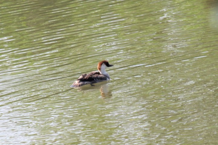 カルガモより明らかに小さく、カワアイサより少し小さく、コガモよほんのちょっと