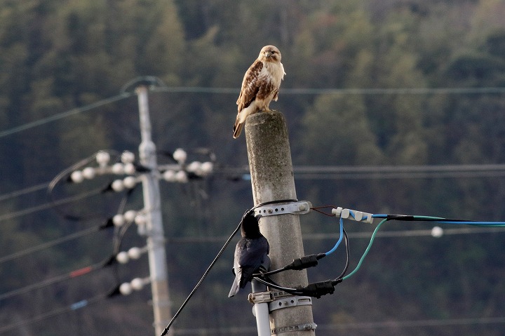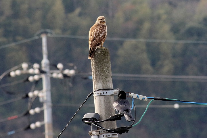 留鳥です。トビより小さい猛禽類です。電柱の上にとまって、獲物を待ち