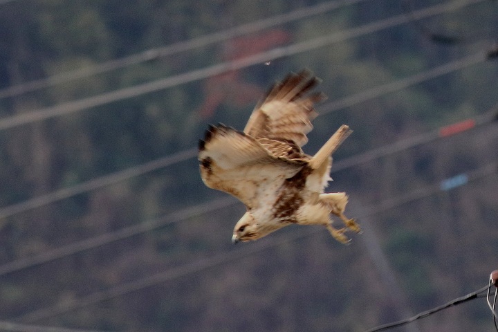 翼を広げて近くに行きました。ノスリは逃げるのかと思いました。