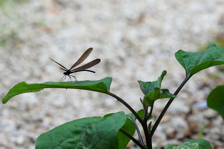 本日の記念撮影の瞬間、突然トンボがナスビの葉っぱにとまりました。