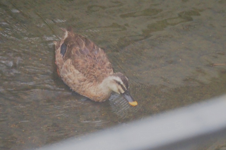 ている小さな川にカルガモが一羽居て餌を食べていました。