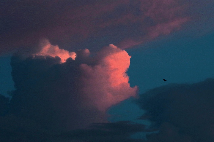 撮影地は部屋の窓です。なんとなく不気味な夕景色でした。鳥は白鷺です。