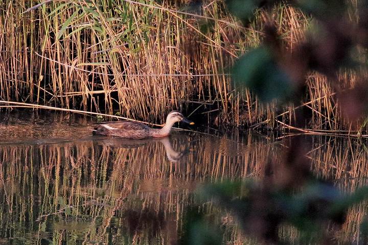 此のカルガモが毎日窓外水域の水辺近くを注意深く見て回っていますので、