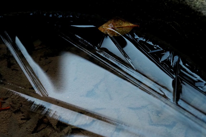 昨朝は気温が下がっていました。庭の水溜まりは水面に薄っすらと氷が張って