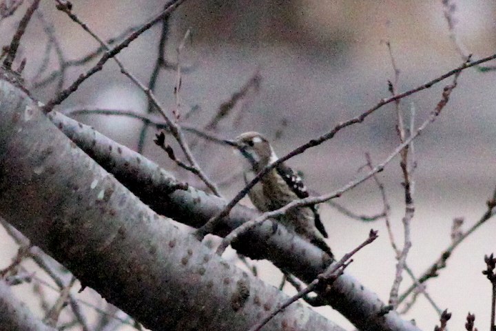 2026年 コゲラ 002 戻る 撮影(03/01) 掲載(03/02) この桜木に小さな鳥が2羽来て、1羽はすぐに飛び去って、残った小鳥がコゲラ でした。 豪快にトリミングして鳥の亡霊のようです。お許しを。 (Canon)EOS 7D EF 200mm F2.8 L II