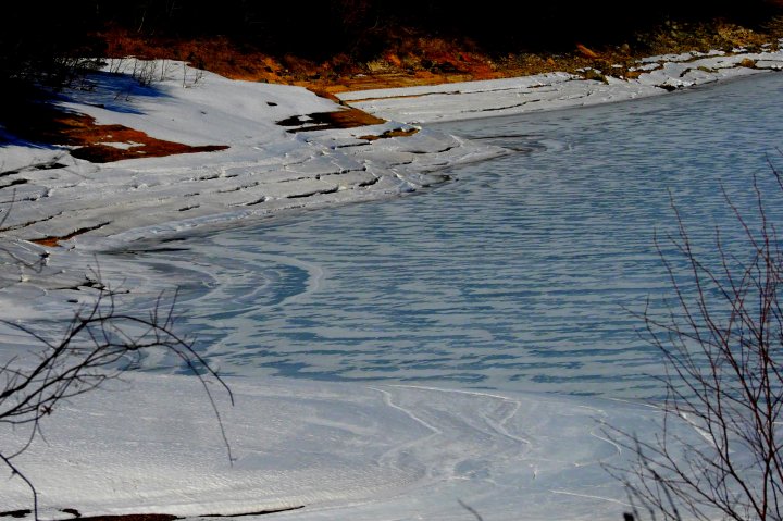 恩原湖です。こんな風景は初めて見ました。湖の表面に積もった雪が、この