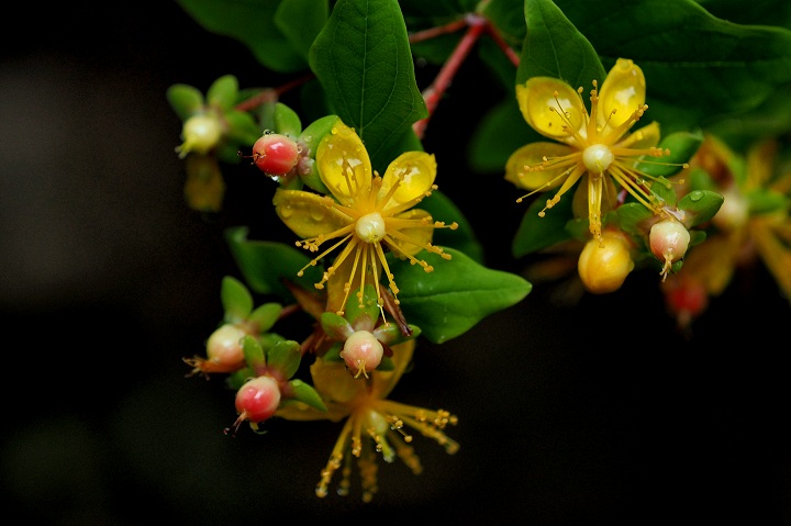 梅雨に洗われたヒペリカムです。撮影地は庭です。